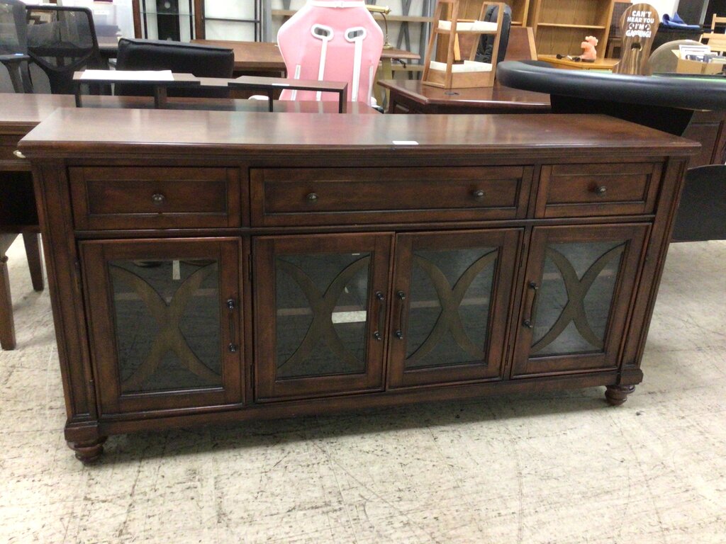 65 in w x 18 in d x 33 in t / Dk Wood / Used